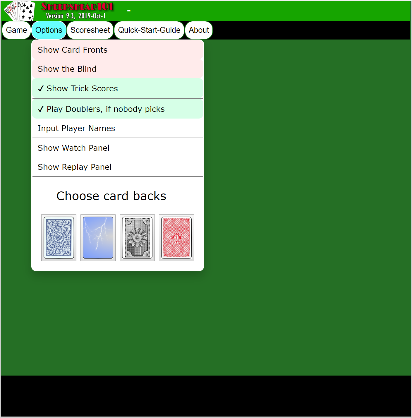 The Options Menu has several options used to play the game. Playing with the cards face up, choosing a pattern for the card backs and displaying the scores after each trick.